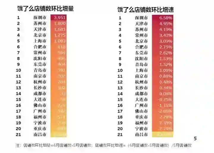 店铺数环比增量排名前五的城市是深圳、苏州、天津、北京、上海;深圳店铺数增长最多,增长了3951个。