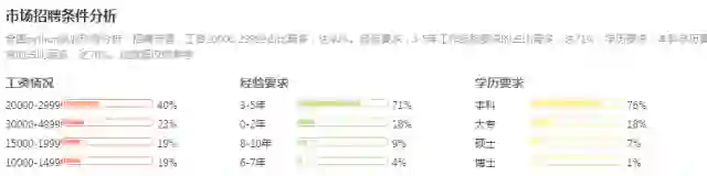 再看薪资情况。在全国范围内,Python 职业的招聘月薪以 20K - 30 K 居多,占比达 40%;而对于经验要求则多为 3 - 5 年,占比 71%;对于学历,相比说让大家颇为担忧的人工智能方向的研究生要求,对于 Python 工程师实际上还是以本科学历要求为主,占比 76%。