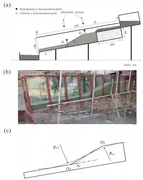 通过开展野外实地考察和室内水槽试验,研究团队发现泥石流沟道中存在两种典型的侵蚀方式:剪切侵蚀和冲击侵蚀,前者以层与层之间的剪切力为侵蚀动力,后者表现为泥石流体与底床的正面冲击效应。由此通过推导,得到非均匀坡沟道中泥石流侵蚀率计算公式:。该研究用一个曲率半径的函数来刻画沟道纵剖面形态变化对侵蚀的影响,并将冲击侵蚀项加入非均匀坡沟道中泥石流侵蚀率计算中。