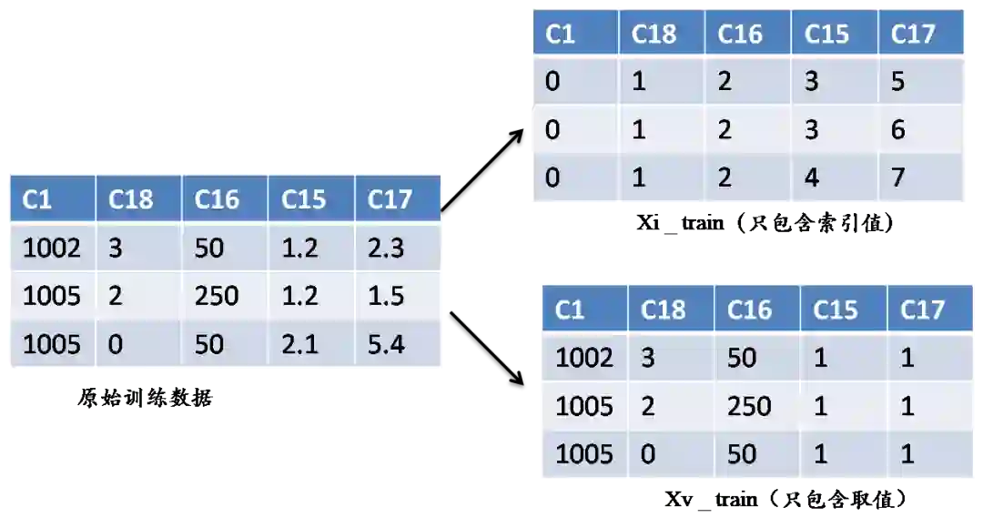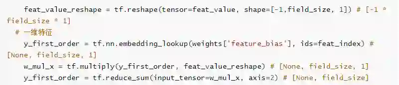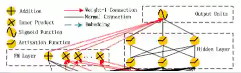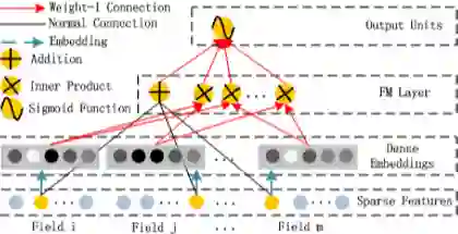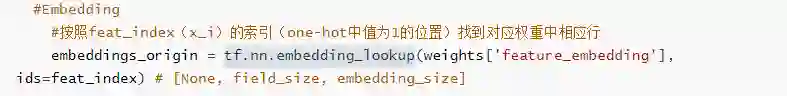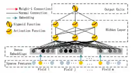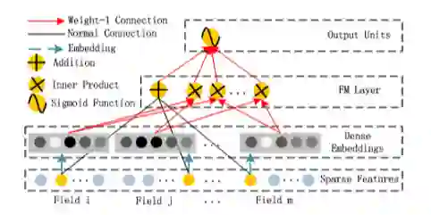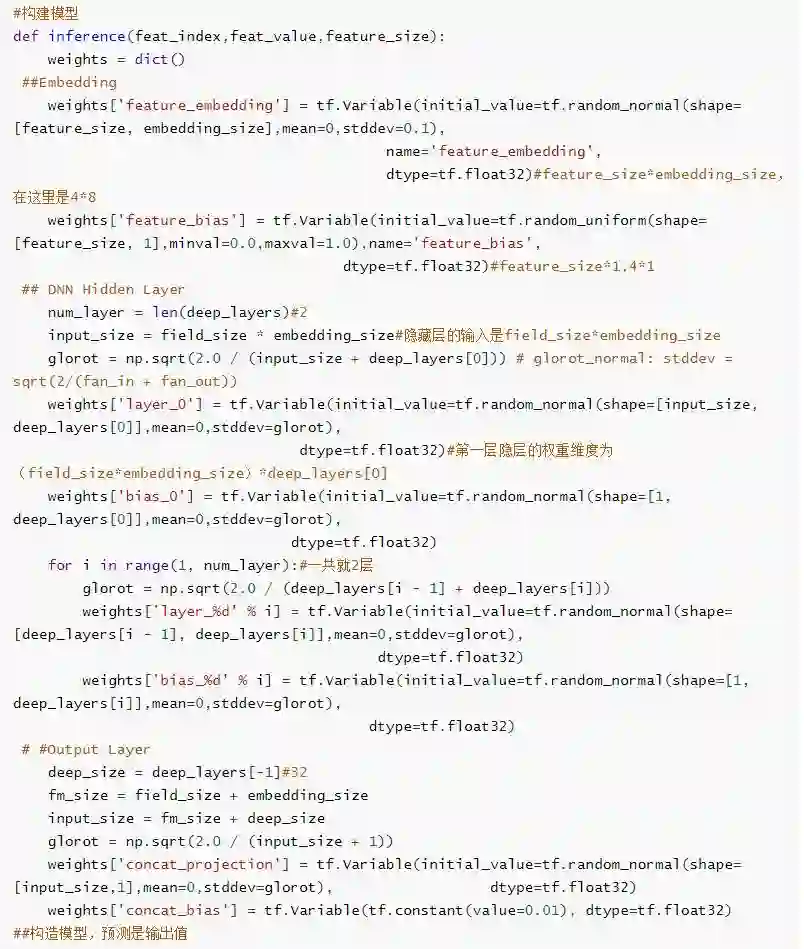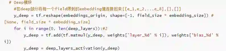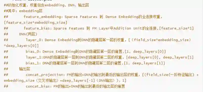Note: 在FM部分和DNN部分,embedding是共享权重的,对同一个特征来说,得到的V_i 相同。虽然输入fields的长度不同,但是embedding之后的长度是一样的。