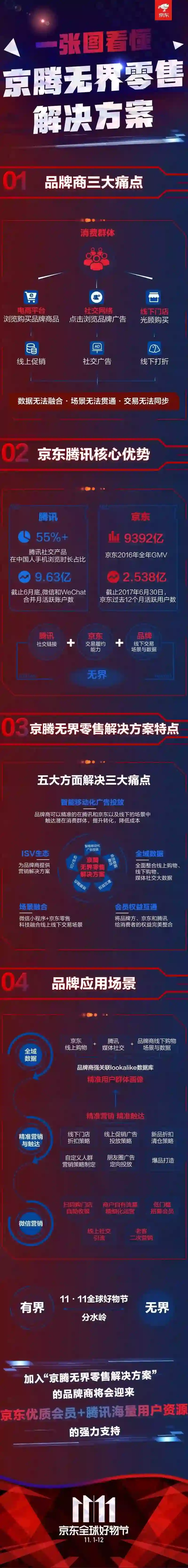 MaryMeeker2016年《互联网趋势》报告显示,腾讯的产品,包括微信、手机QQ、QQ浏览器、腾讯新闻、腾讯视频等,占据中国网民55%+的移动消费时长。根据腾讯Q2财报显示,截止6月底,微信和WeChat的合并月活跃账户数达到9.63亿。根据Questmobile《 移动互联网2017年Q2夏季报告》:微信月度人均在线时长达到1,911分钟。在这个场景当中,还没有任何一平台商或品牌商形成完整的数据闭环。这对于品牌商来说,这也是走向未来零售场景中最大的蓝海所在。而据中国规模最大零售商京东集团财报显示,按照行业标准其2016年全年GMV达到9392亿元;截至2017年6月30日,过去12个月的累积活跃用户达2.583亿。腾讯的连接能力和京东的交易、履约能力,恰恰能帮助品牌商结合线下能力完成走向无界零售的最后一环。据徐雷介绍,这个方案主要包括如下几个方面: