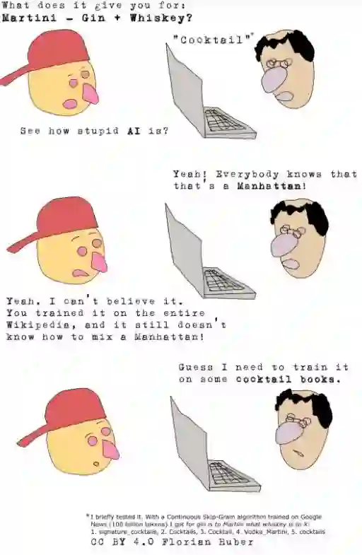 我强烈推荐大家研究一下词向量!词向量非常有趣,你可以找到许多预训练好的网络,这样一来你就可以迅速上手了。不妨试试这里的词向量运算器:http://vectors.nlpl.eu/explore/embeddings/en/calculator/。如果你想自己在各种各样的书籍数据上进行训练,我强烈推荐 Dave Arnold 编撰的「Liquid Intelligence」。