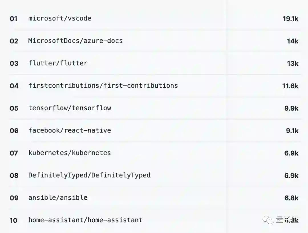 贡献最多的开源项目来自微软的VS Code (19.1K)、Azure Docs (14K)和Flutter (13K)。
