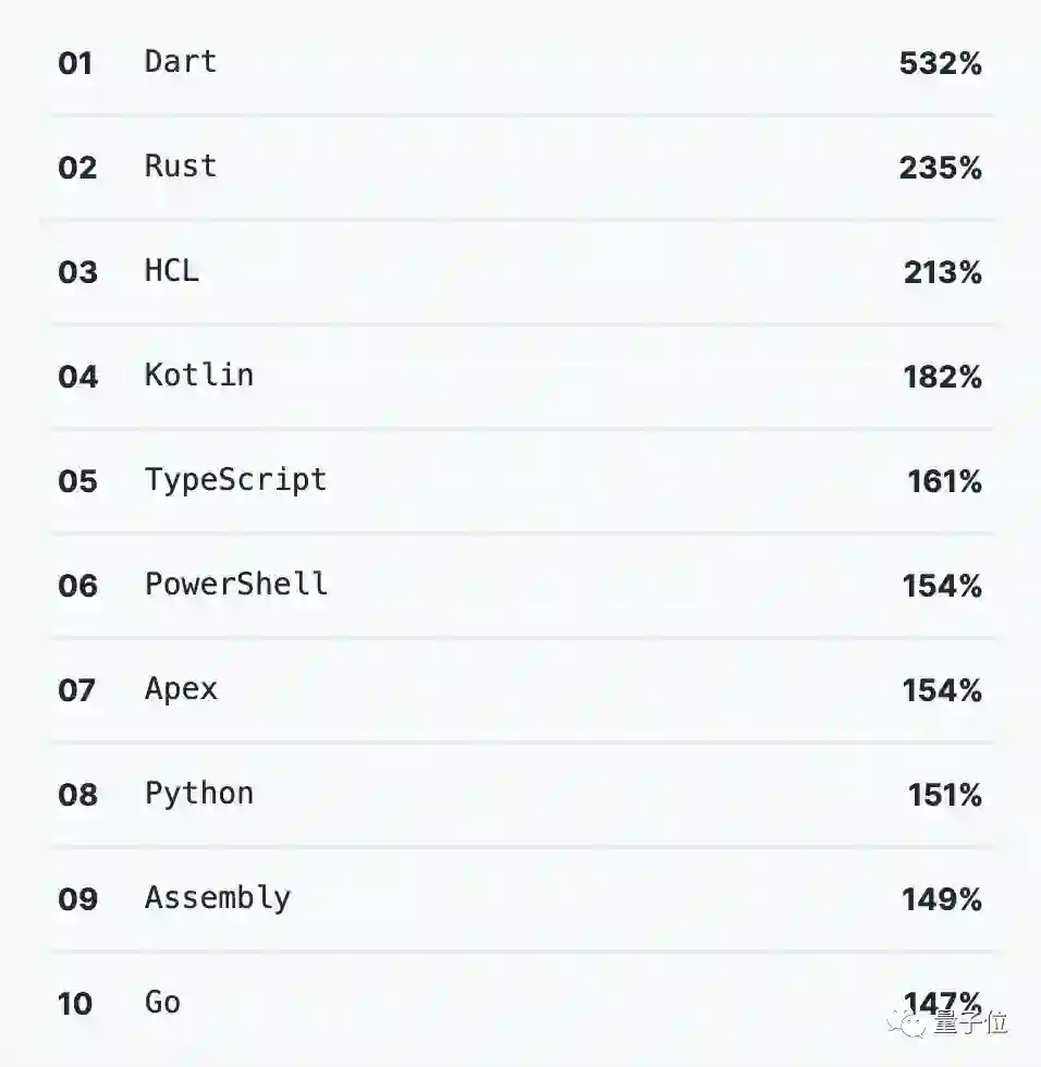 其次是Rust、HCL、Kotlin和TypeScript。