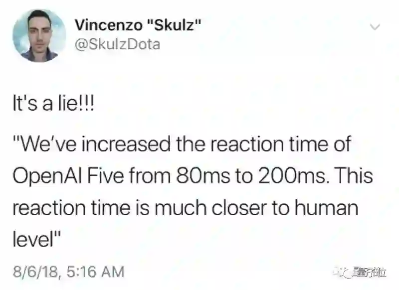 另外,赛前OpenAI团队表示,在人机对战中会把AI的反应时间,下调到与人类相似的200毫秒,以求公平竞争。