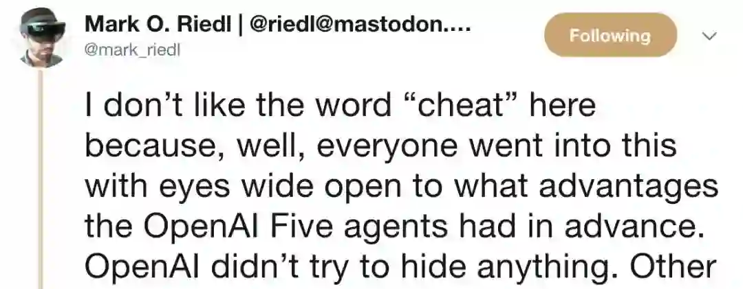 比如,提出“AI该靠视觉来跟人类同场竞技”的Mark Riedl教授本人,就很排斥这个说法。