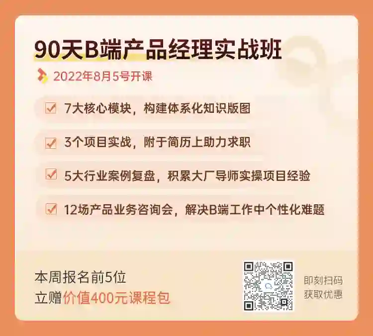 推荐你来《90天B端产品经理实战班》提升,多位10年+经验大厂实战导师在线直播,带你掌握系统的B端产品工作方法,助你顺利转岗&提升专业能力。