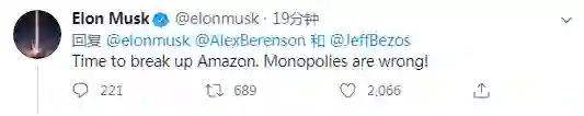 特斯拉CEO马斯克:是时候拆分亚马逊了,垄断是错误的!