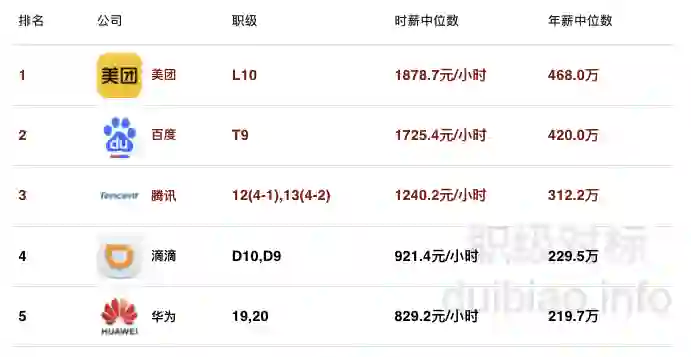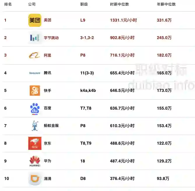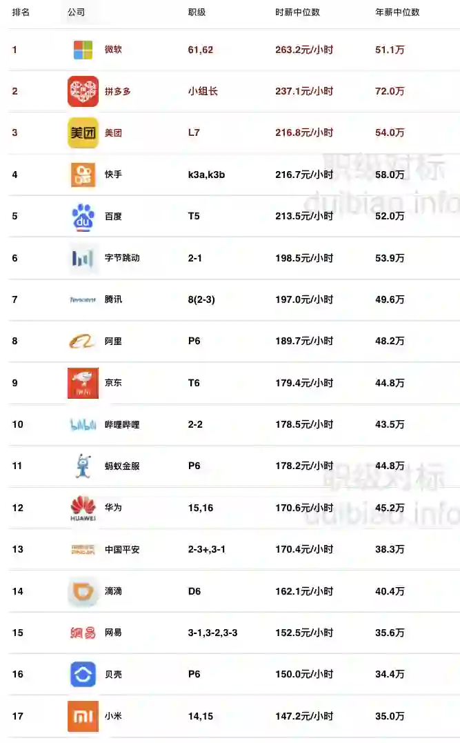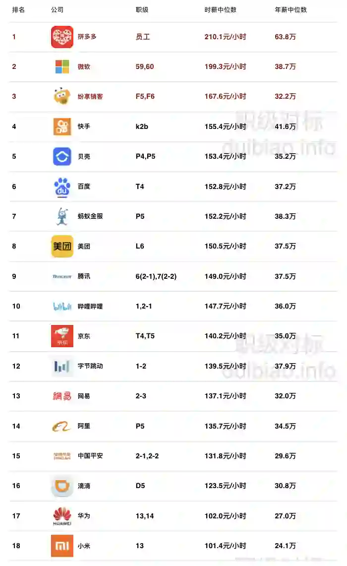 鉴于大厂的加班情况严重,我们觉得应该开发一个时薪的排行榜,以厘清单位时间内,哪个公司的薪酬最高。以下是我们的统计结果(注:中国最低时薪为22元左右):