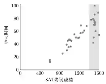 为了解释限定范围问题,我们假设有两个变量:SAT 总成绩和学习时间。然而,我们并没有所有 SAT 考生的成绩数据,只有那些数学和语文成绩总分超过 1400 分(图 3-5 中的灰色区域)的考生的成绩数据。在这个假设的数据中,成绩好的考生包括那些天生擅长考试的考生(他们不学习也能考得好)和后天刻苦学习的考生。如果仅使用灰色区域的考生的成绩数据,我们是无法找到这两个变量(SAT 总成绩和学习时间)之间的相关性的。但如果我们使用的是所有考生的考试成绩数据,就会发现这两个变量之间存在很强的相关性(灰色区域的考生的学习时间与考试成绩之间的皮尔逊相关系数为零,而在整个数据集中,二者的皮尔逊相关系数为0.85)。所以说,我们可以通过以某种结果为限定条件(只研究出现某种结果的案例),然后从毫无关联的变量之间找到相关性。如果 SAT 成绩好且课外活动丰富的学生能够被名校录取,那么仅来自于这些高校的数据则会显示 SAT 成绩和很多课外活动之间存在某种相关性,因为在这个群体中,这两个变量(SAT 成绩好且参加很多课外活动)往往是同时出现的。