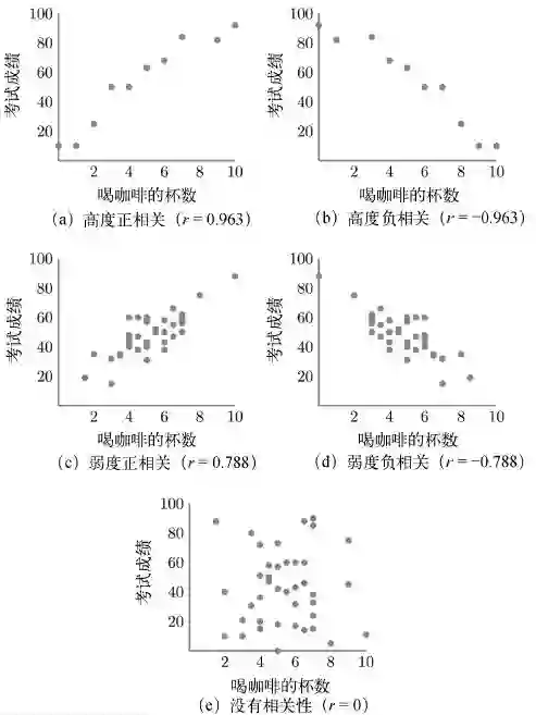 图3-3 喝咖啡的杯数和考试成绩之间不同强度的相关性