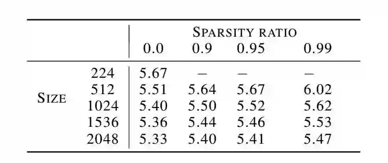 下表给出了不同模型尺寸和稀疏程度的稀疏 WaveRNN NLL 分数。