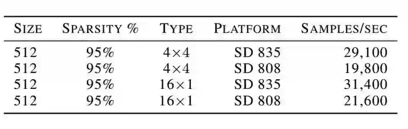 上表是稀疏 WaveRNN 移动采样性能基准实验结果,实现平台为通用骁龙 808 和 835 移动 CPU。模型有 1024 个隐藏单元,95% 稀疏度和 4x4 稀疏结构。