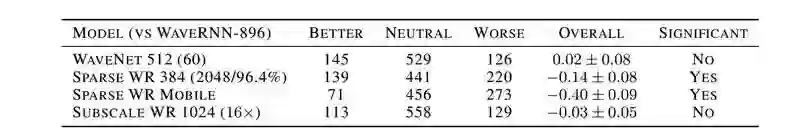 表 1 给定模型和 WaveRNN-896 模型之间的 A/B 对比测试