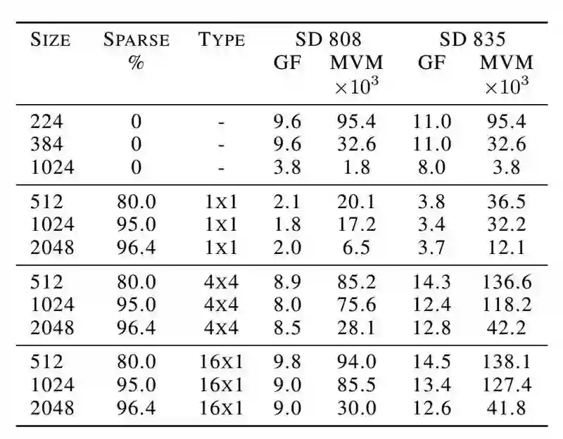 表 7 每秒 ARM 矩阵向量相乘(MVM)和对应的 Gflops,低功耗处理器使用骁龙 808 和 835。