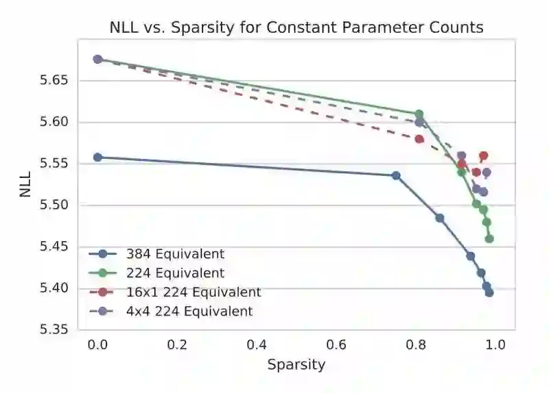 在参数固定时,大型稀疏 WaveRNN 比小型密集 WaveRNN 表现性能要好,而且这一对比关系在稀疏程度高达 96% 时也能保持。