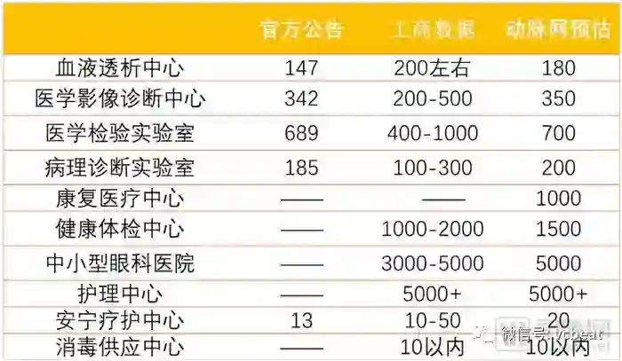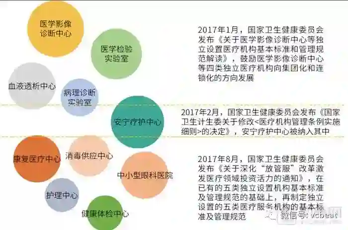 2017年8月,国家卫计委发布《关于深化“放管服”改革激发医疗领域投资活力的通知》,新增5类独立设置的医疗机构类别,包括:康复医疗中心,护理中心、消毒供应中心、中小型眼科医院、健康体检中心。