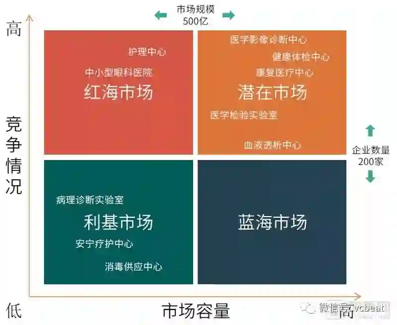 潜在市场:市场容量大,竞争激烈。潜在市场一般包括发展已经相对成熟的行业,如健康体检中心和中小型眼科医院。它们已经在中国市场化耕耘多年,但是就算行业内的龙头企业依然面对残酷的竞争,可能陷入低价竞争的困境当中。