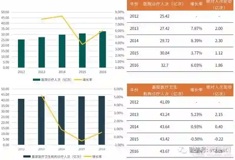 根据《2017中国卫生和计划生育统计年鉴》的数据,从2012年至2016年,中国医院的诊疗人次从25.42亿次上升至32.70亿次,年均复合增长率为6.50%;基层医疗机构的诊疗人次从41.09亿次上升至43.67亿次,年均2017复合增长率仅为1.53%。