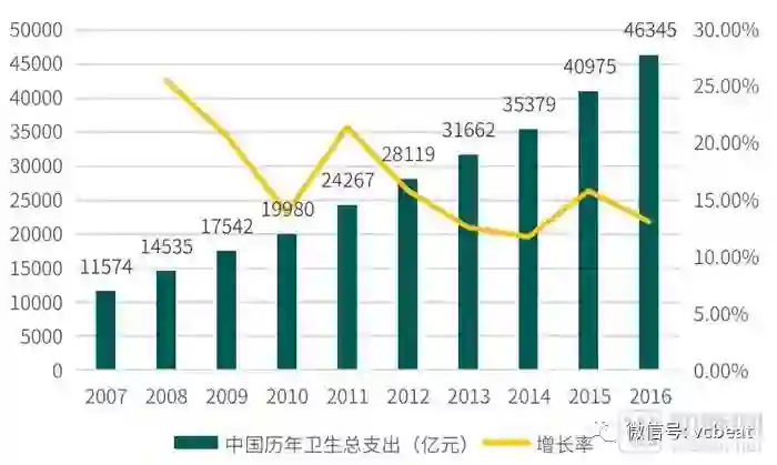 根据历年的《中国卫生和计划生育统计年鉴》显示,中国从2007年至2016年的十年间,全国卫生支出由1.16万亿元上涨至4.63万亿元,全国卫生支出占GDP的比重由4.32%上涨至6.23%,中国居民的医疗需求可见一斑。