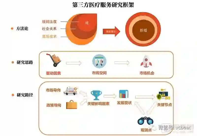 我们的研究路径便确定为从政策影响和市场影响这两条路线分别出发,寻找这两类因素推动下的第三方医疗服务市场的关键影响因素,评估行业发展现状,确定观测点并深度跟踪,试图在这场第三方医疗服务市场重新域定的过程中抓住发展得关键节点。