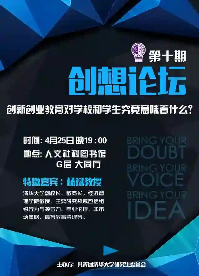 创想论坛由校研究生团委发起并主办,以“知维创想,行践创新”为核心精神,邀请学术大师、业界大牛、创业团队、清华学子针对热点问题或科技前沿交流对话,以此来营造学术界和产业界思想交锋的空间并提供两界大咖与学子开放对话的平台。