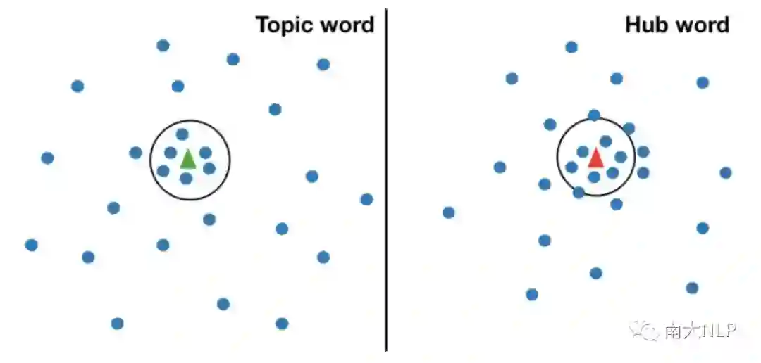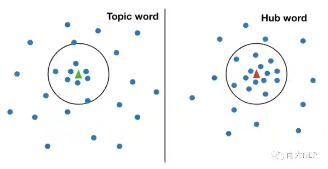 将两个词向量空间映射到公共空间之后,需要通过推断函数将单词一一配对生成词典(图5)。最先使用的推断函数是最近邻(nearest neighbour, NN),但是遭遇一个非常严重的问题,叫做“hubness”(图6)。“hubness”是指一些无意义的目标端单词(如1988-03, aaaa)在映射后会成为非常多源语言单词的最近邻。后来CSLS公式被提出解决这个问题,它在NN的基础上通过计算词语与周围K(论文作者推荐设置K为10)近邻词语的平均相似度来进行惩罚,避免hub word成为翻译。但是我们观察到语言空间中还有另一种词与hub word具有相似的特性,叫做topic word(图6)。这类词代表了很广泛的一类词,因此也和周围的词也具有非常高的平均相似度。因此CSLS经常会将topic word当成hub word错误地惩罚。幸运的是,我们发现调节CSLS中的超参数K可以有效的解决这种问题。解释如下:当K很小时,两种单词与周围K近邻单词都具有非常高的平均相似度(图7)。而当K逐步增大时,topic word与周围词的平均相似度会下降,hub word则依然与周围词保持很高的平均相似度,这种情况下就可以分辨出两者了。我们提出了一种近似搜索K值的算法:以10为步长增大K,直到模型在训练集上的性能出现衰减,就以上一步的K值作为CSLS的超参数。