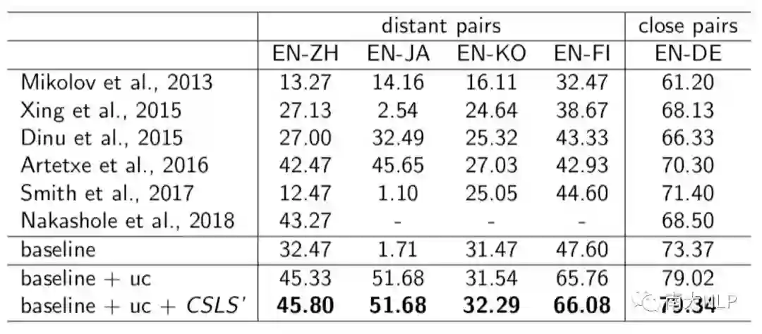 然而当有监督双语词典推断方法被迁移到远距离语言对上时(如En-Zh, En-Ja),性能将出现巨大的衰减。之前这个问题并没有得到广泛的关注,本文希望深入分析并解决这个问题。