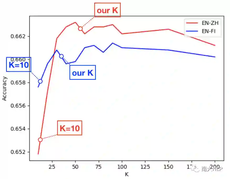 映射部分观察K值与准确率的关系(图7)可以发现:作者推荐的K=10远远不是最佳设定。我们的搜索算法所确定的K值是更好的,并且克服了topic word被错误翻译的现象。