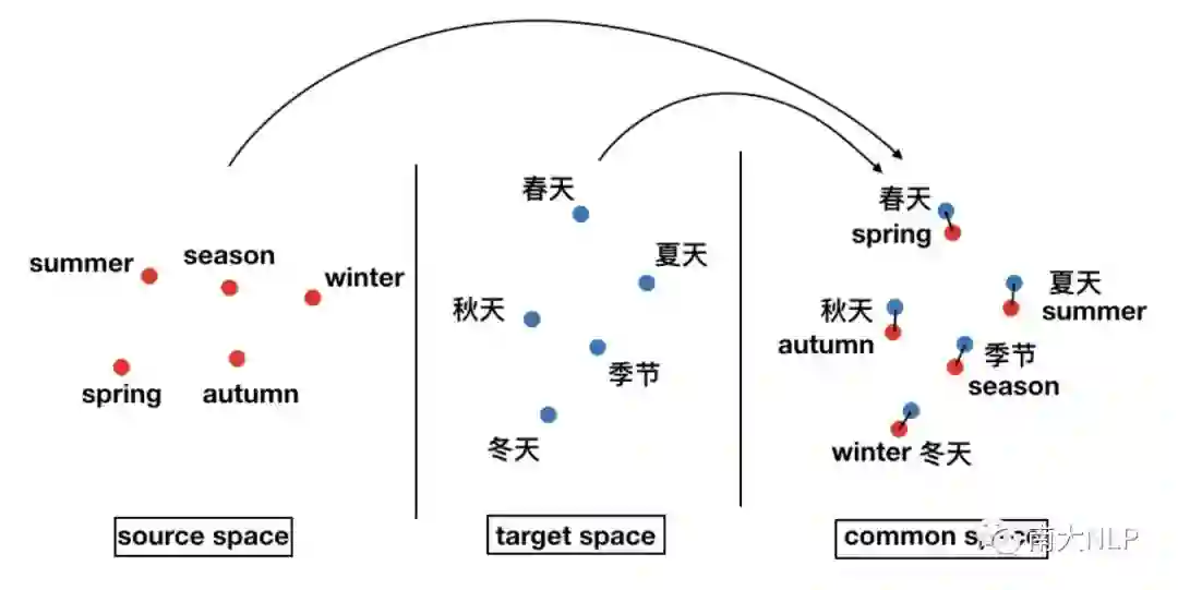 双语词典是机器翻译(Machine Translation,MT)的重要组成部分。传统上,编纂一份词典需要借助大量的人力物力和专家知识。Mikolov等人2013年提出可以通过一个线形映射对齐两种语言的词向量空间,进而推断双语词典(图1),这大大提升了生成词典的效率。近年来,双语词典推断模型(Blingual Lexicon Induction,BLI)不断发展,在欧洲语言对上取得了非常好的效果。