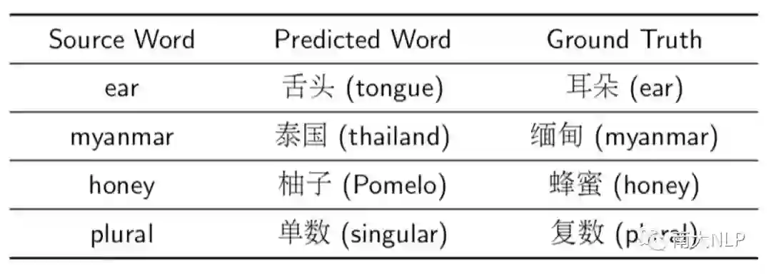 我们进一步分析了我们的改进框架,观察错误翻译样例发现,大部分剩余错误都属于同一个类型。在表4中列出了一些有代表性的例子(表4)。可以发现错误的原因都是无法区分两个上下文相似的词。词向量的训练方法决定了拥有相似上下文的单词在语言空间中的分布会十分接近,这大大增加了词典推断的难度。这也是未来我们希望解决的问题。