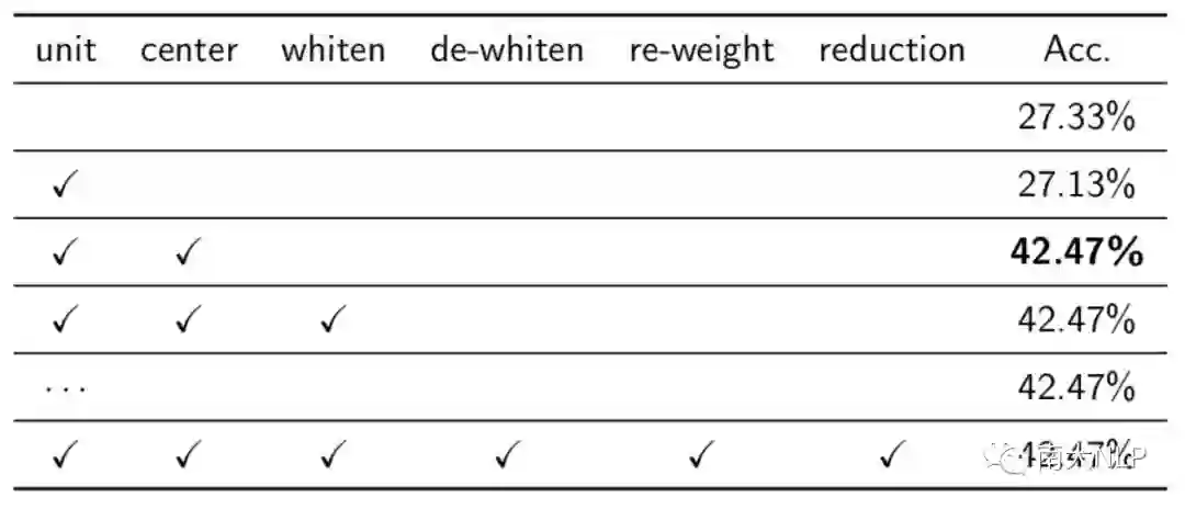 我们在Fasttext数据集上进行了实验。在预处理部分(表1),我们发现中心化和单位化是最优的组合,并且中心化为模型带来了最大的增益。