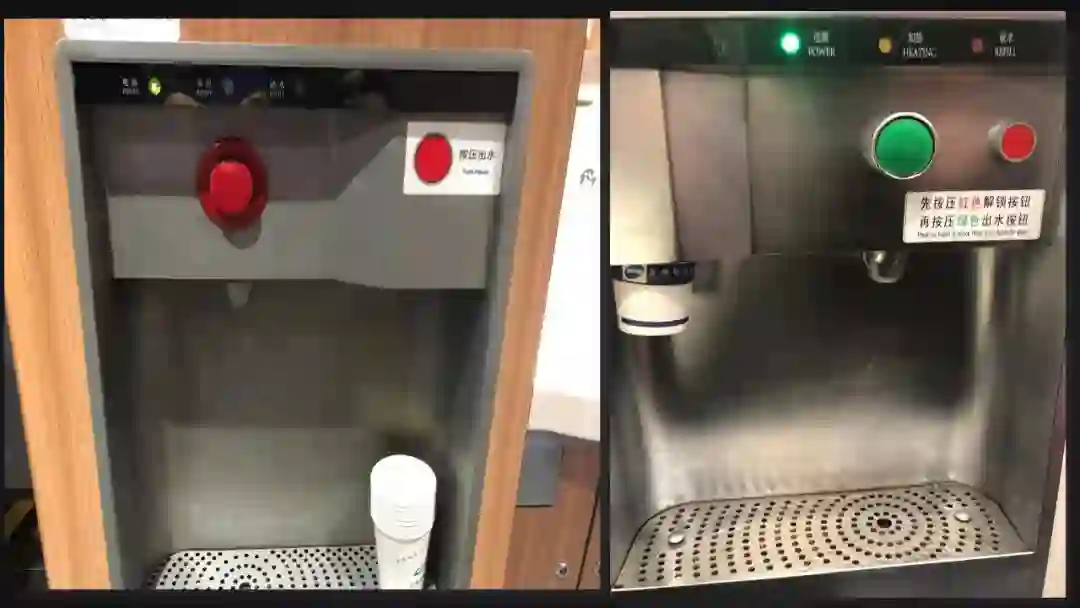 我觉得很奇怪,怎么回事?然后我就拿着杯子去看了一下,这是我看到的情况。热水器的出水按钮是红色的,我猜很有可能是因为是红色按钮,所以大叔没按。