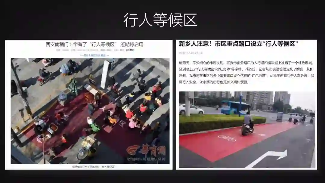 从2015年开始,我关注到这样一项举措——行人等候区,这很大程度上是为了应对中国式过马路的问题。行人等候区已经在很多城市都得到了推广,但是我发现一个非常有趣的问题,绝大多数城市的行人等候区是这种鲜红的红色。