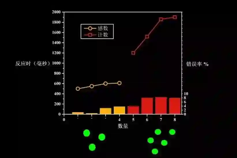 心理学研究发现,对于简单的任务,它在我们大脑里其实有两个完全不同的加工过程。对于三个点,我们对它是快速的并行的加工,看一眼就大概知道它有几个了,不容易出错。我们称之为感数。