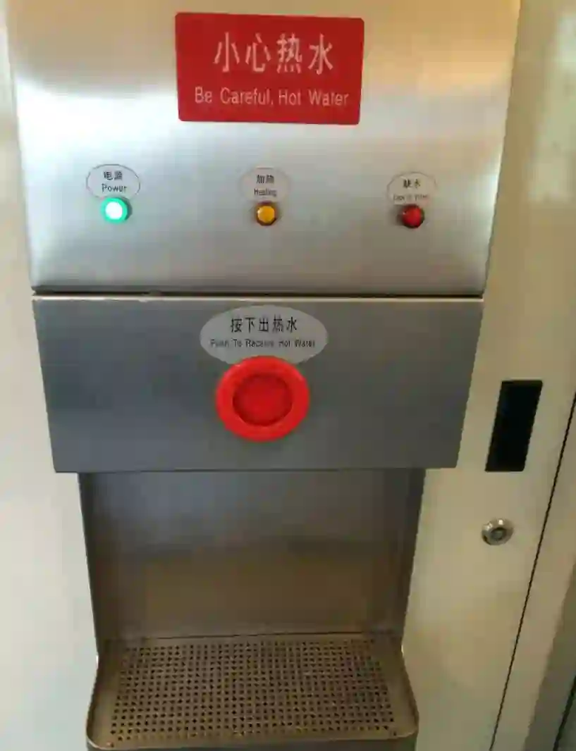 有一次我在高铁上看到我前面的一位大叔要取热水,他拿着空杯子走到热水器那边。过了一会,他又拿着空杯子回来了。
