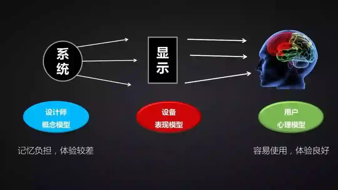 如果这个表现模型和设计师的概念模型相接近,那就出问题了,用户就要学习设计师的概念模型,要知道设计师究竟是怎么想的,需要进行学习,他的体验就会比较差。但是反之,如果它和用户的心理模型相一致,用户就不用去学习,就会出现好的用户体验。
