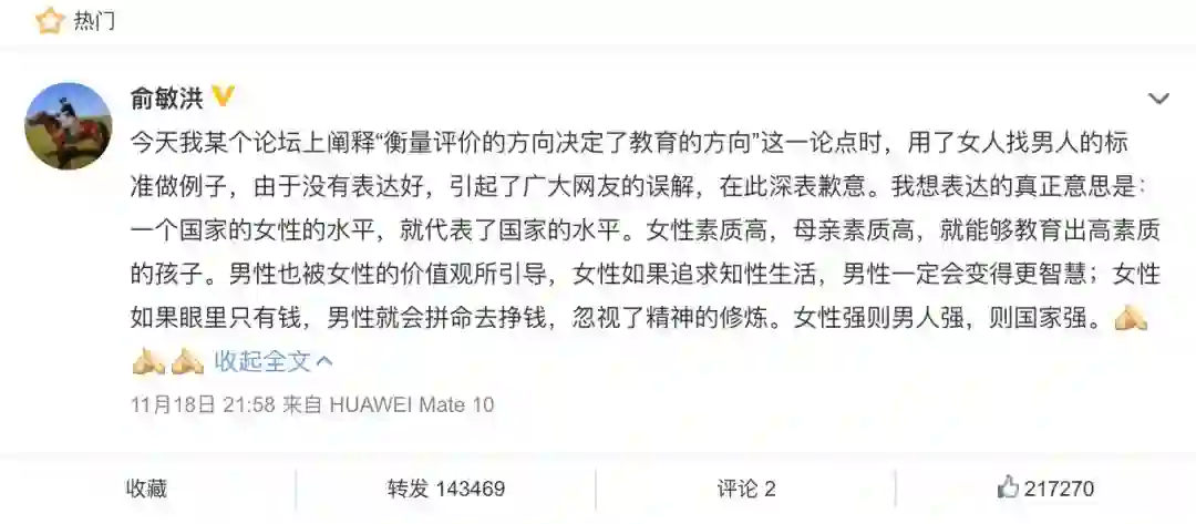 当天稍早些时候,在2018学习力大会上,俞敏洪表示衡量和评价的方向决定了教育的方向,就像女生挑选男生的标准决定了这个国家男人的方向。演讲原文是,“如果中国所有女人挑选男人的标准,是男人会背唐诗宋词,那么所有男人都会把唐诗宋诗背得滚瓜烂熟;如果中国所有的女人都说中国男人就是要他赚钱,至于他良心好不好我不管,那所有的中国男人都会变得良心不好、但是赚钱很多的男人。一个国家到底好不好,我们常常说在女性就是这个原因。因为中国女性的堕落,导致国家的堕落。”此言一出,全场静默数秒。