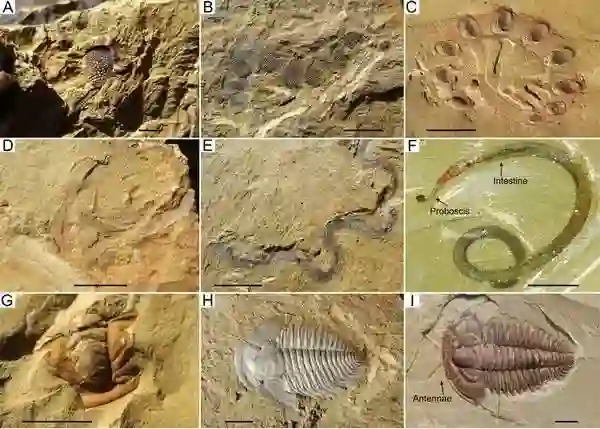 我国云南的澄江动物群是全球寒武纪最早的特异埋藏化石群,保存大量具软躯体或弱矿化外壳的后生动物化石,展示了寒武纪大辐射时期海洋生态系统和后生动物多样性特征,是全球研究“寒武纪大爆发”演化事件最重要的化石宝库。图为澄江地区典型的生物化石