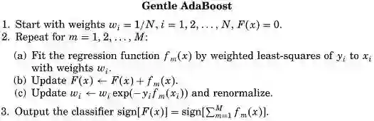考虑到在检索端需要对广告和天气的特征关系进行打分,因此分类模型不能完全满足我们的需求。最终我们选取了AdaBoost的改进版Gentle AdaBoost,有关该模型的论述网上有很多(根据文献1,在采用树桩模型时,该模型效果好于传统的离散AdaBoost),本文不再对其进行数学说明。算法大致流程如下图所示: