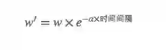衰减方案根据时间进行衰减。默认半衰期(即衰减权重从1衰减到0.5的时间长度)为72小时(不同的店铺分类给予不同的半衰期),使用牛顿冷却定律,参数计算公式为: 0.5 = 1 × e-α*时间间隔 ,解出α,并带入下面公式得到实际权重为: