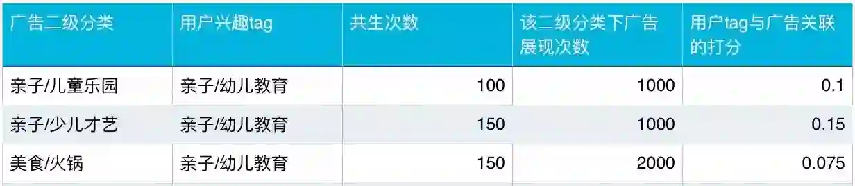 “美食/火锅”更为大众化,因此访问量远大于“亲子/儿童乐园”,上列访问量虽为虚构,但与实际认知相符。上列表格想要说明的是,像“美食/火锅”这样的广告分类,可能与很多用户标签的共生次数都很高,但由于它本身是大众化的分类,因此分母取值也很大,则实际关联打分就会很小(除非是强相关兴趣)。