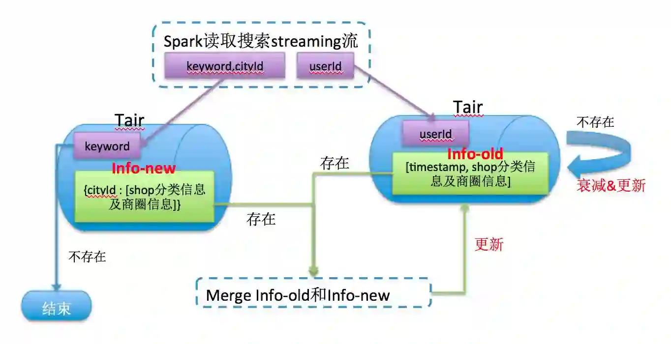 用户A在早上8:30有火锅类搜索行为,Spark Streaming处理后进入Tair,假设此时最新时间戳为8:30,而该用户在11:00搜索亲子类商铺,Spark Streaming处理该条记录后,之前的火锅权重需要衰减,同时时间戳更新为11:00,假设此时立即有广告检索请求命中该用户,则此时用户火锅类偏好权重为11:00时权重;假设下午16:00有ADX请求命中该用户,则用户火锅类权重需要根据16:00到11:00的时间间隔继续衰减。