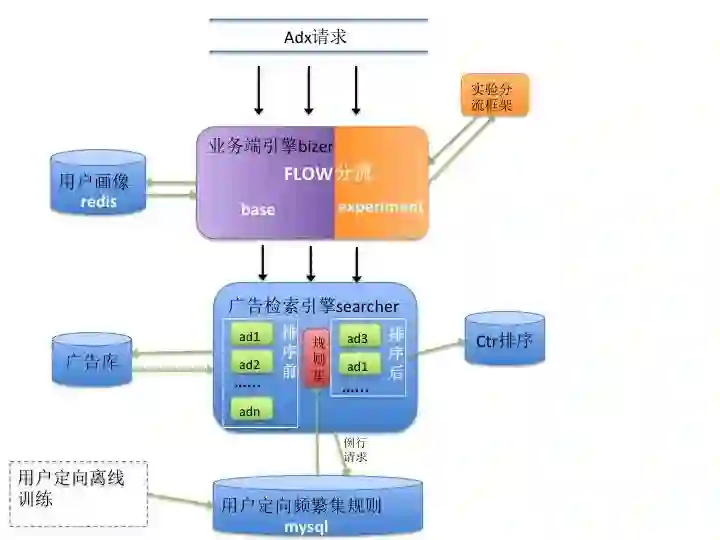 检索端每天定时加载一次离线结果到内存中。对于实时广告请求,先从Redis读取当前用户设备的用户画像,然后根据用户实时位置等条件召回几百条广告后,对于当前流量中有用户画像的,根据离线训练结果,对广告进行打分及排序,排序后会根据线上的设置进行截断。用户定向的整体应用框架如下: