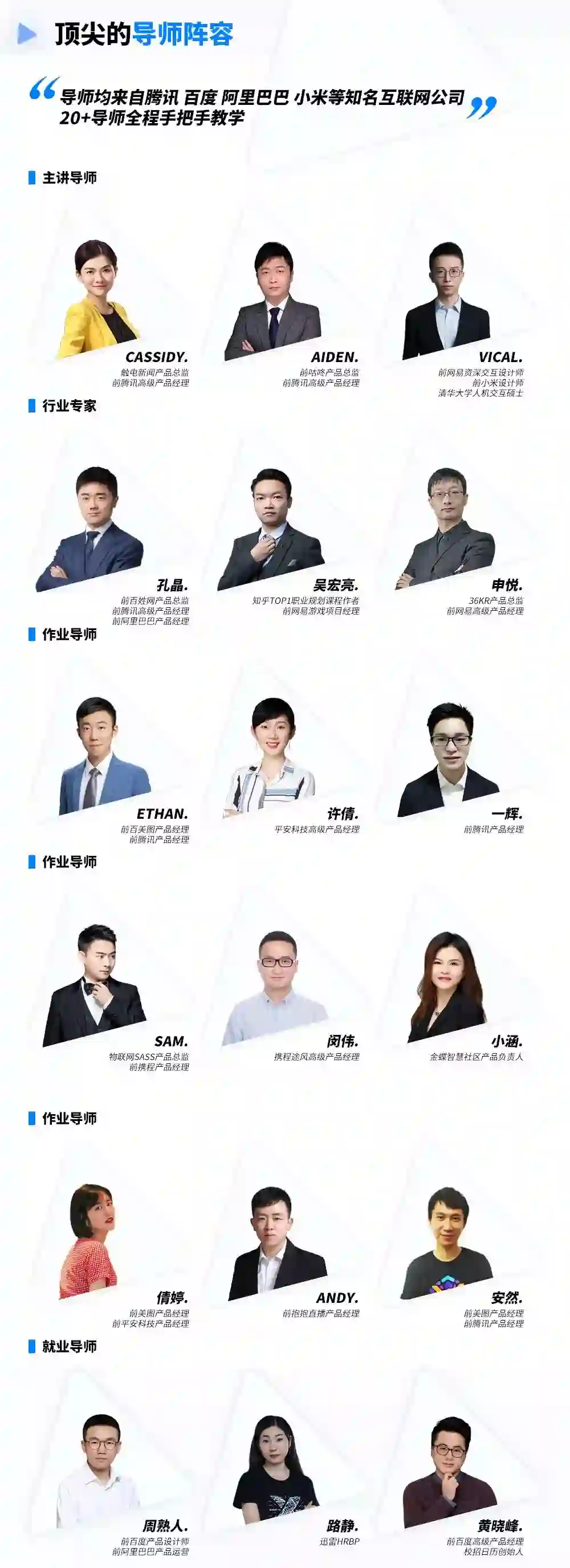 最终是否能达成目标,靠的不仅仅是教学内容本身,还需要资历深厚的一线互联网产品导师来保障你的“教·练·做”,导师们会为你带来比其他课程更多、更优质的教学服务——通过200+录播课、N次社群聊一聊、20+直播课、9次作业答疑、4次方向指导、3次1V1咨询等服务,将成熟的思维&方法论深入浅出地传授给你。