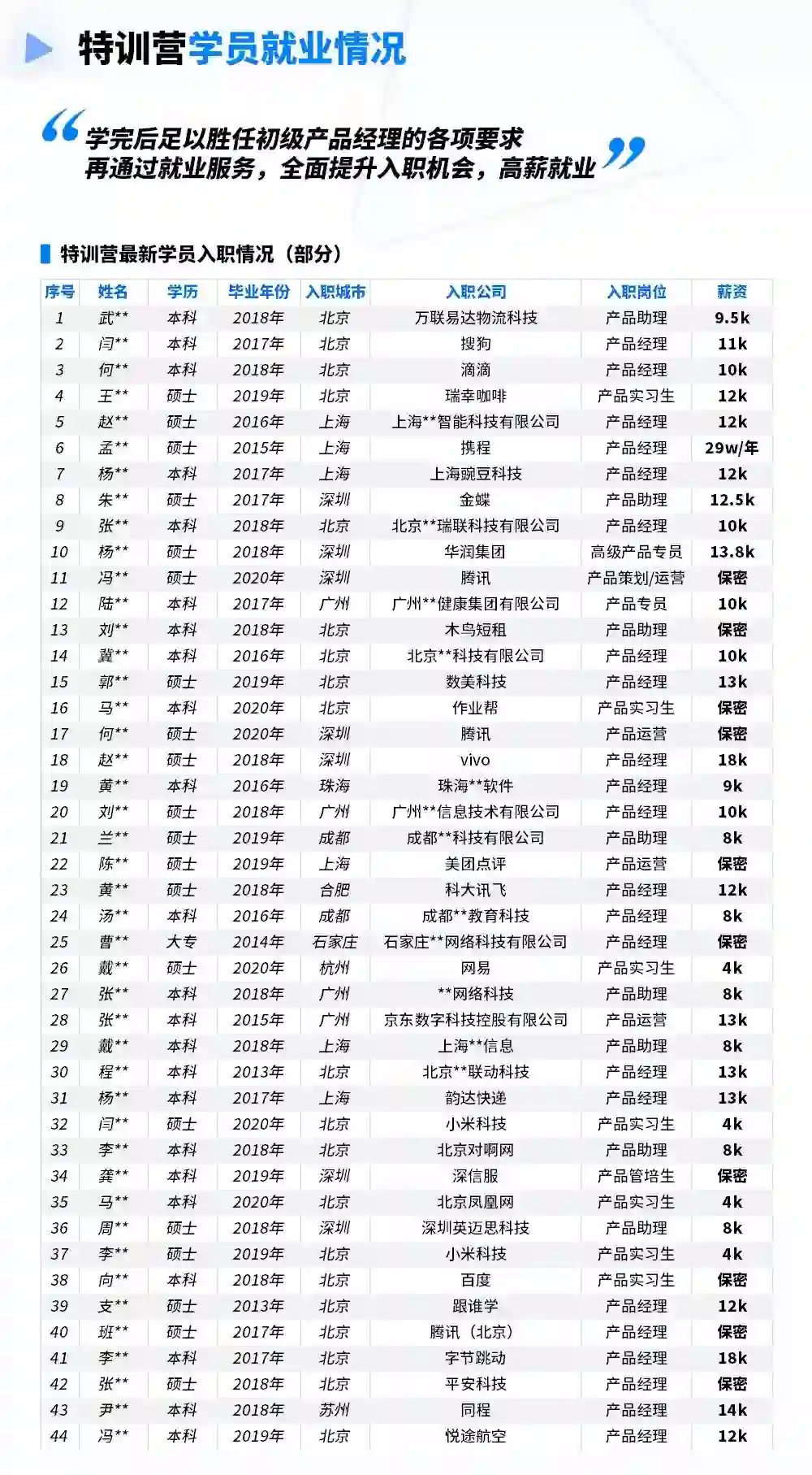 学习的最终目的是成为企业需要的产品人才,成功就业。业内其他产品课程,听完课就“戛然而止”了,导致很多学员依旧不懂互联网公司对产品经理有何要求,如何针对性优化简历,如何寻找适合自己的岗位机会,如何在面试中充分展现自己的产品能力,如何进行合理的薪资谈判……