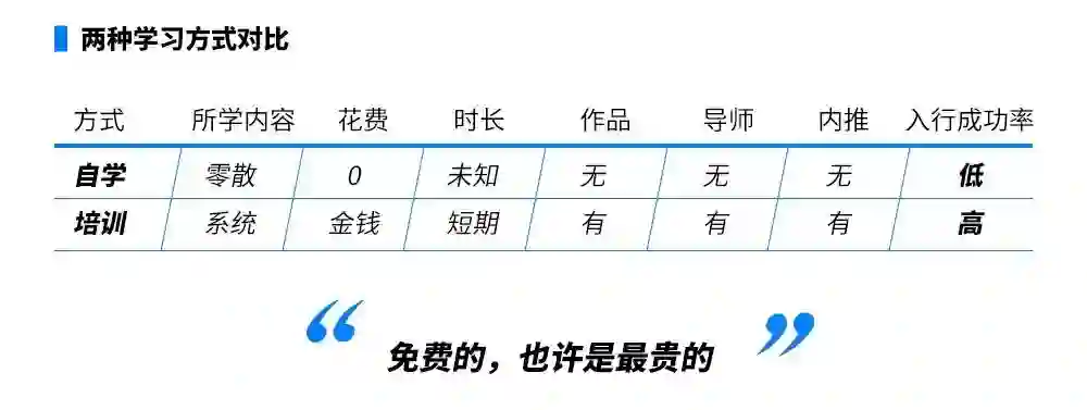 对于想转岗产品的小白而言,大多都希望掌握产品的必备技能,例如以上所谈及的撰写PRD文档,来输出一份求职作品,打开产品的大门,其实选择适合的学习方式很重要,以下列举两种最常见的学习方式进行对比分析。