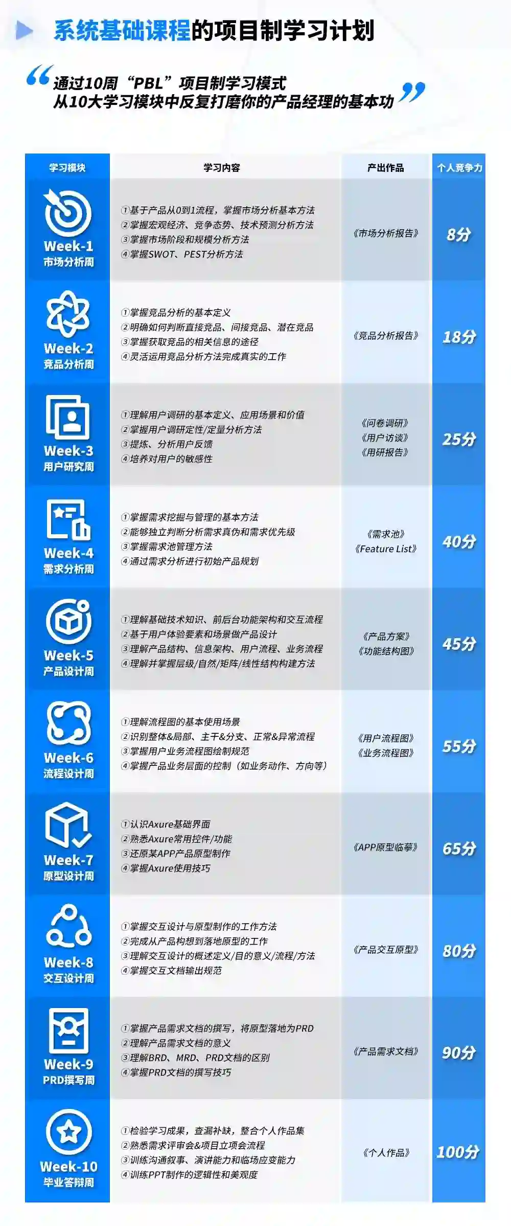与产出作品相匹配的,是为你量身定制的“10周线上陪伴式教学模式”,所学内容源自BAT产品培养体系和市场上企业的招聘需求,每一周你都会通过“大量刻意练习+输出倒逼输入”掌握一个产品模块的方法论,10周后你就能达到或超过不同企业的招聘标准。