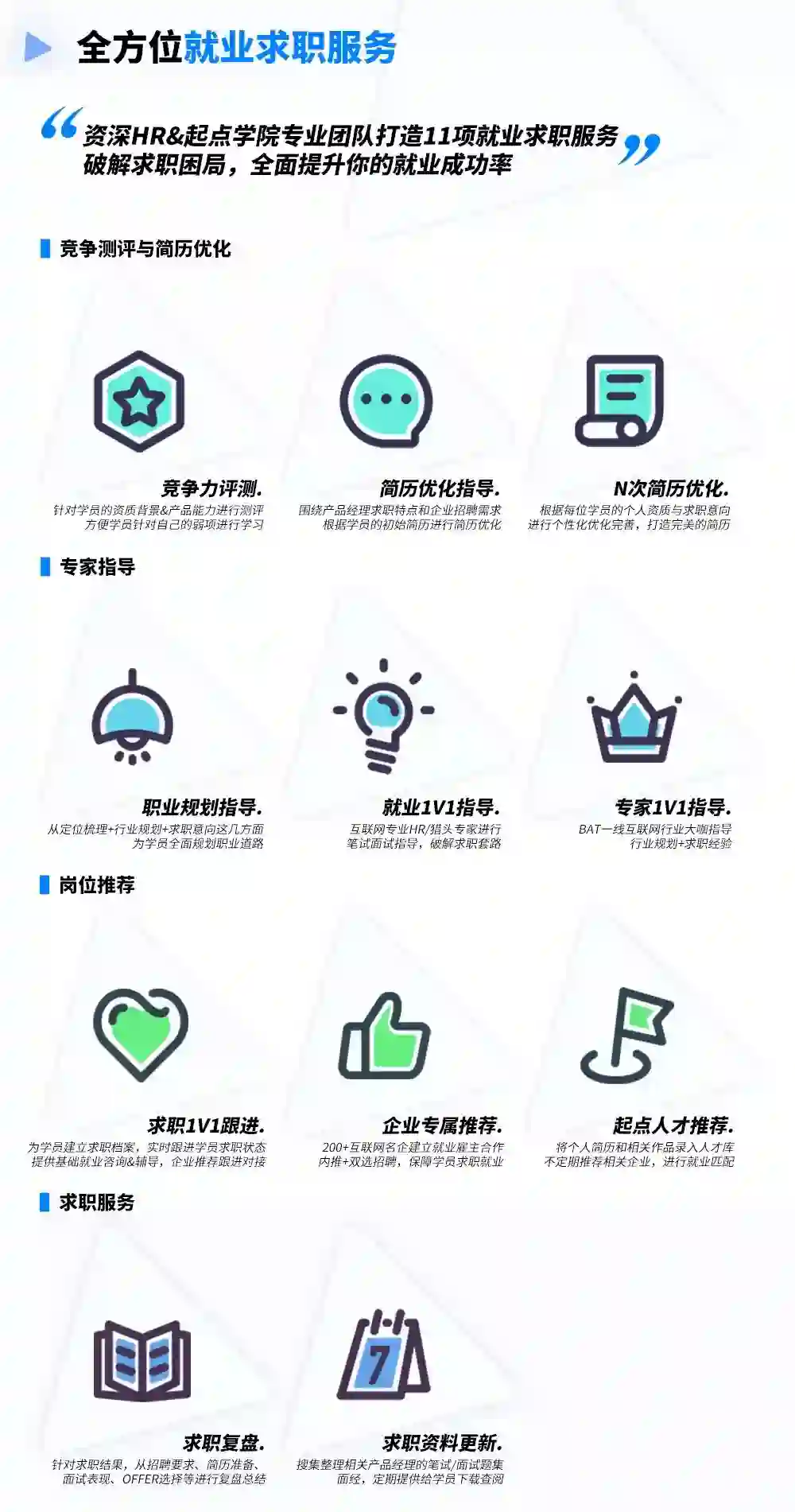 事实上,产品技能和求职技能同样重要,求职技能高低往往决定你能否拿到产品offer。因此,特训营另一个特色在于“就业”,基于企业招聘需求提供11项求职就业服务,由就业服务老师、招聘管家全程为你给你支招,知己知彼打有准备的仗,直到你能拿到Offer,成功入职为止。