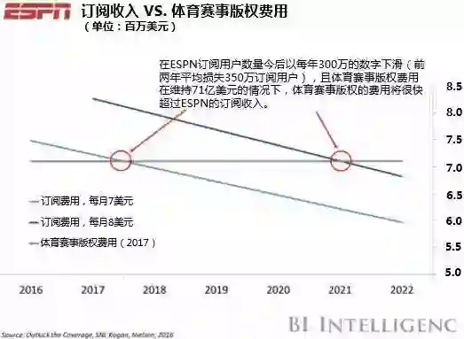 电视业务中赚钱的绝对主力又是迪士尼旗下的付费订阅体育频道ESPN,全球最大的体育频道之一,NBA转播权的持有者。但近年来,ESPN的订阅用户数持续下降,六年失去了1300万订阅用户,订阅量创下10年最低点,2017年底的订阅量已经从最高点的1亿跌至约8700万。订阅数下降也使ESPN的巨额版权费用成为了日益沉重的负担。